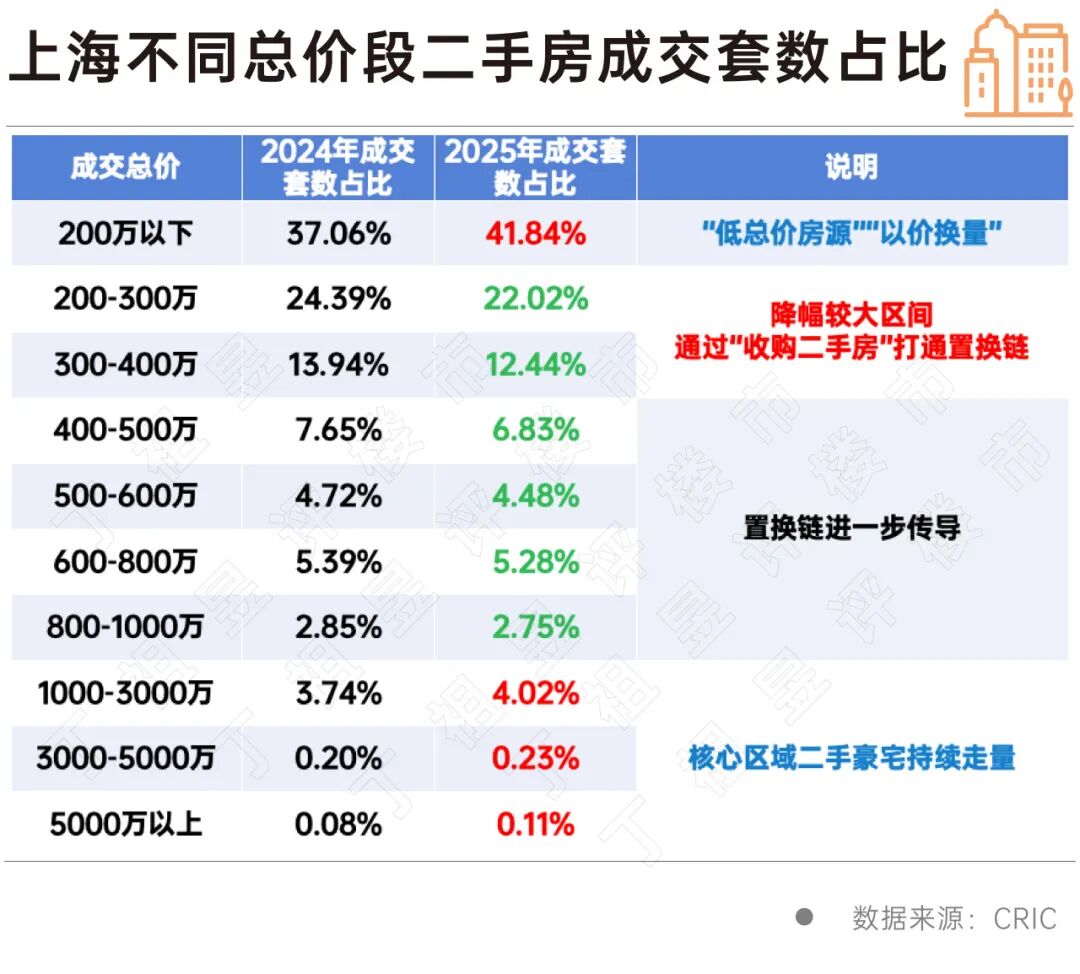 数据显示,2025年上海二手房总价200万以下及1000万以上成交套数占比较2024年出现上升,总价200-1000万成交套数占比呈不同程度下跌。