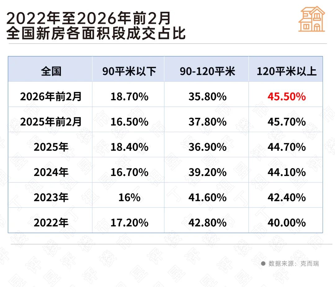 2026年前2月,全国120平方米以上新房成交占比达到45.5%。而这一数字在2022年还只有40%。