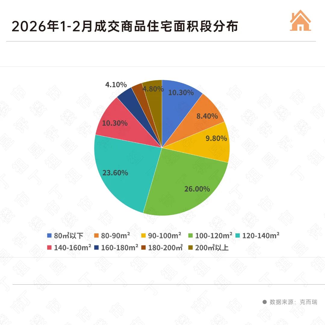 相较之下,全国90-120平米面积段产品成交占比从2022年的42.8%逐步缩减至2026年前2月的35.8%,减少了7个百分点。
