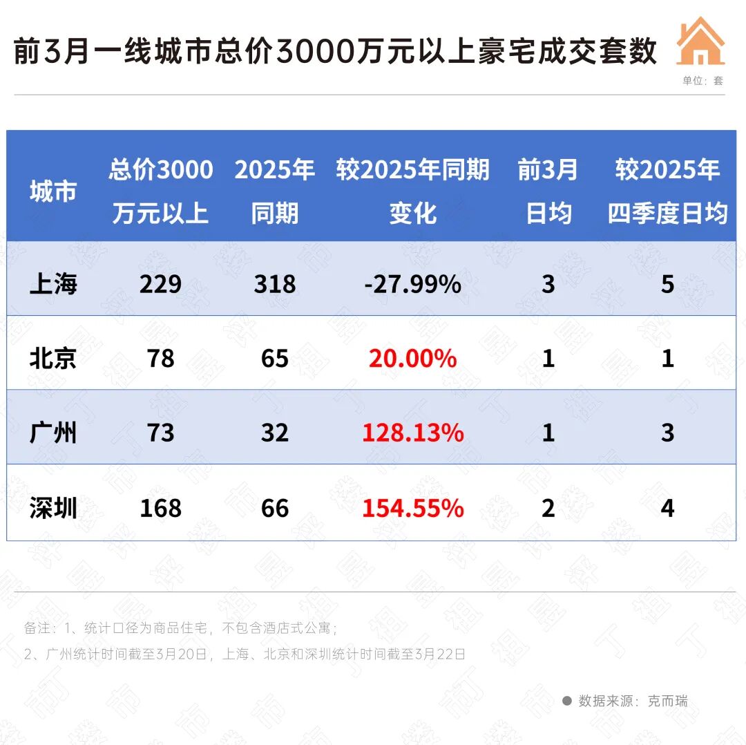 截至3月22日的数据显示,四大一线城市总价3000万以上高端住宅网签成交同比增长14%。
