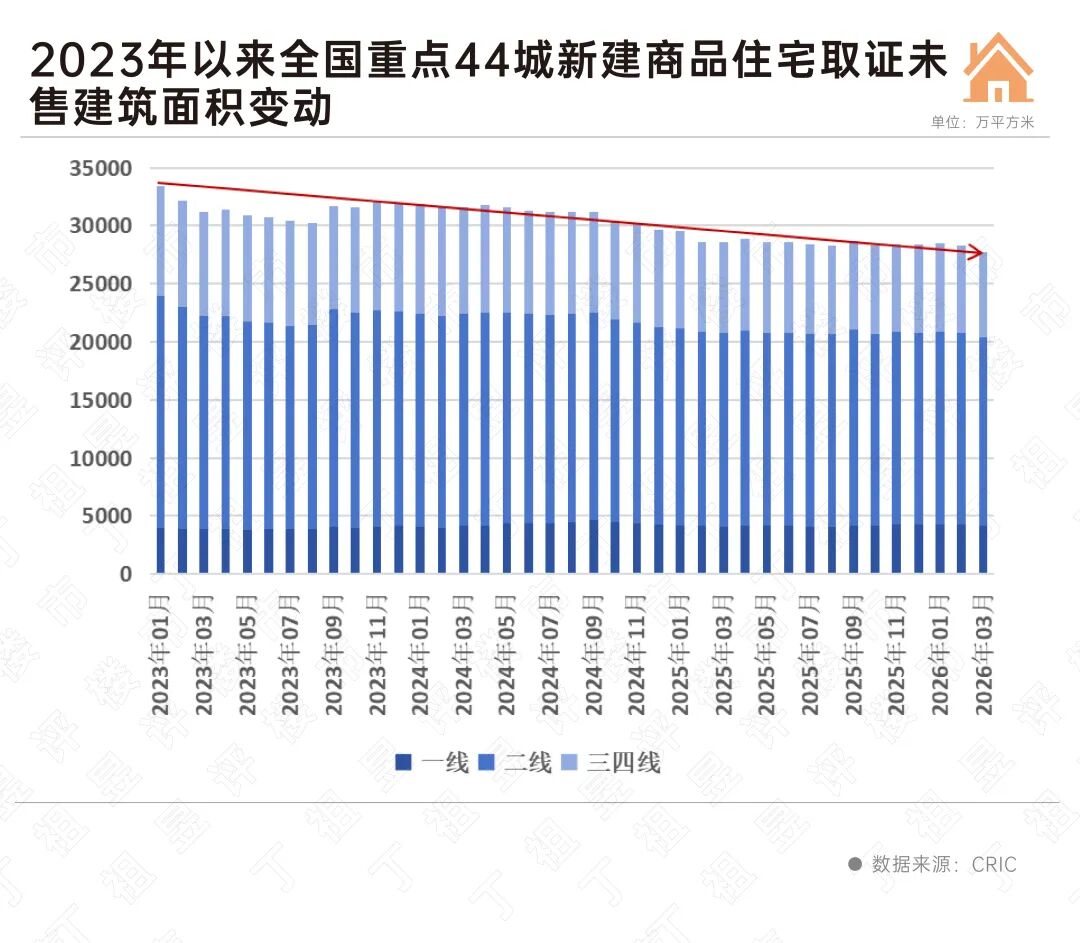 另一组数据来自CRIC监测的一季度重点44城新建商品住宅取证未售库存面积,截至3月末,这一数字降至2.77亿平方米,同比去年一季度、环比2025年四季度齐降,并持续小幅下降至阶段性低位。