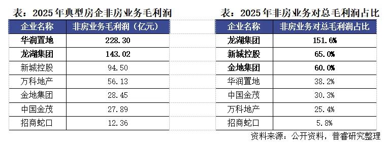 从披露2025年非房业务盈利水平的7家典型房企情况来看,排名前二的华润置地和龙湖集团的非房业务毛利润都超过了100亿元。其中华润置地以228.30亿元的非房业务毛利润位居榜首,凭借全链条资源整合能力,在商业运营、物业服务等多元板块构建了成熟盈利模式,规模优势显著。