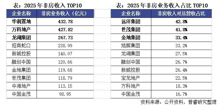 具体来看,华润置地、万科地产、龙湖集团稳居2025年房企非房业务收入前三,分别为432.78亿元、427.82亿元和267.73亿元,这些企业通常依托自身品牌、渠道、客户资源,布局了商业运营、物业服务、产业地产等多元非房业务板块,形成了成熟的盈利模式,非房业务成为其营收的重要组成部分。