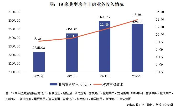 从已经披露2025年度业绩且非房地产开发业务(以下简称:非房业务)收入较高的19家典型房企来看,近年来房企非房业务收入对总营收的占比呈现上升趋势,从2022年的8.2%提升至2025年的13.9%。除了房地产销售收入整体下滑的原因之外,也反映出房企在寻求新增张曲线和风险分散方面的努力。